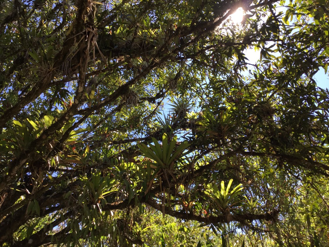 We took the 6.30 am bus up to the Santa Elena Cloud Forest Reserve. Admission price: A$20 each. The reserve covers 765 acres and the elevation is generally 1600 metres. It is a communal project managed by the administrative board of the Santa Elena Technical High School since 1992. Strong winds swept overhead and the tallest trees swayed back and forth – the wind sounded like waves rolling onto a shore in the far distance. It is like an enchanted forest. Here all the trees are heavily draped with lichens and mosses. Epiphytes and bryophytes line the branches. Tree ferns, vines and mosses add to the overwhelming shades of green upon green. A visual and sensory experience.