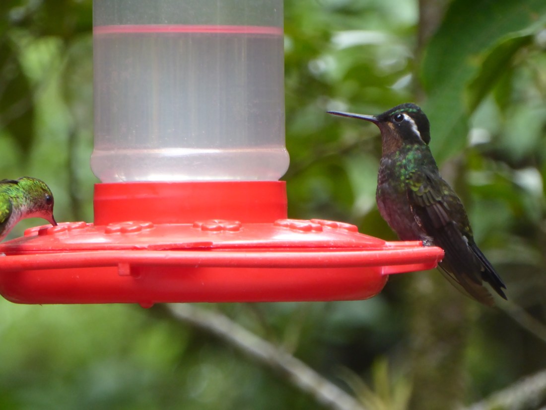 We visited the bakery opposite the Monteverde Cloud Forest Reserve – a coffee and cake was essential by 1pm. The feeders were well attended by all the local hummingbirds, and even the odd species that I would not usually associate with such a feeder, such as a Banaquit. These feeders contain a sugar-water solution to attract hummingbirds -admittedly this is how you can have a really close look at hummingbirds. When visiting flowers they flit so quickly from flower to flower it is difficult to focus on them. Sugar solution is contentious and opinions differ as to whether this harms the birds or not. I plan to do a seperate hummingbird blog post.